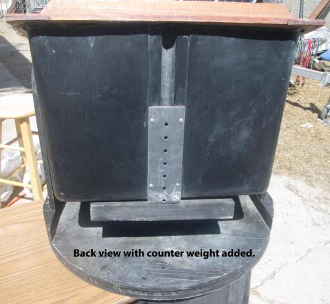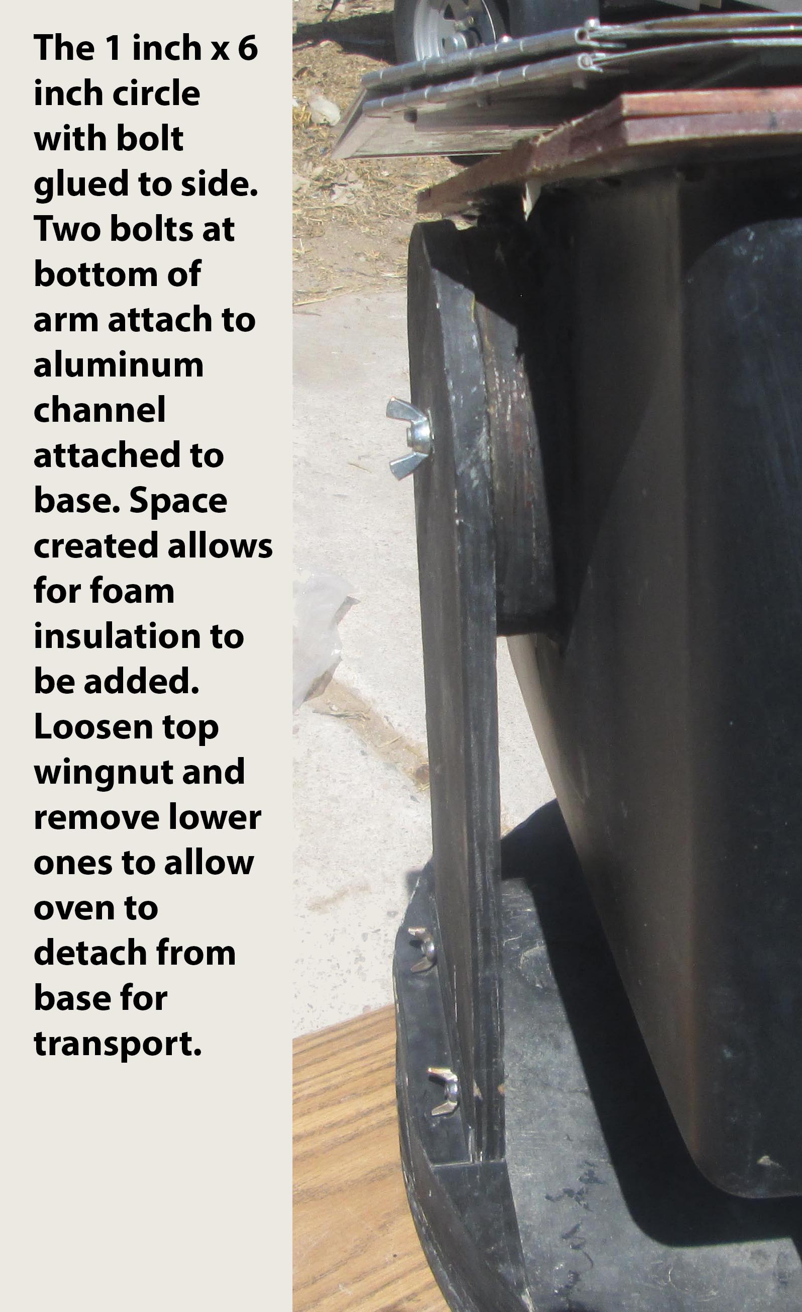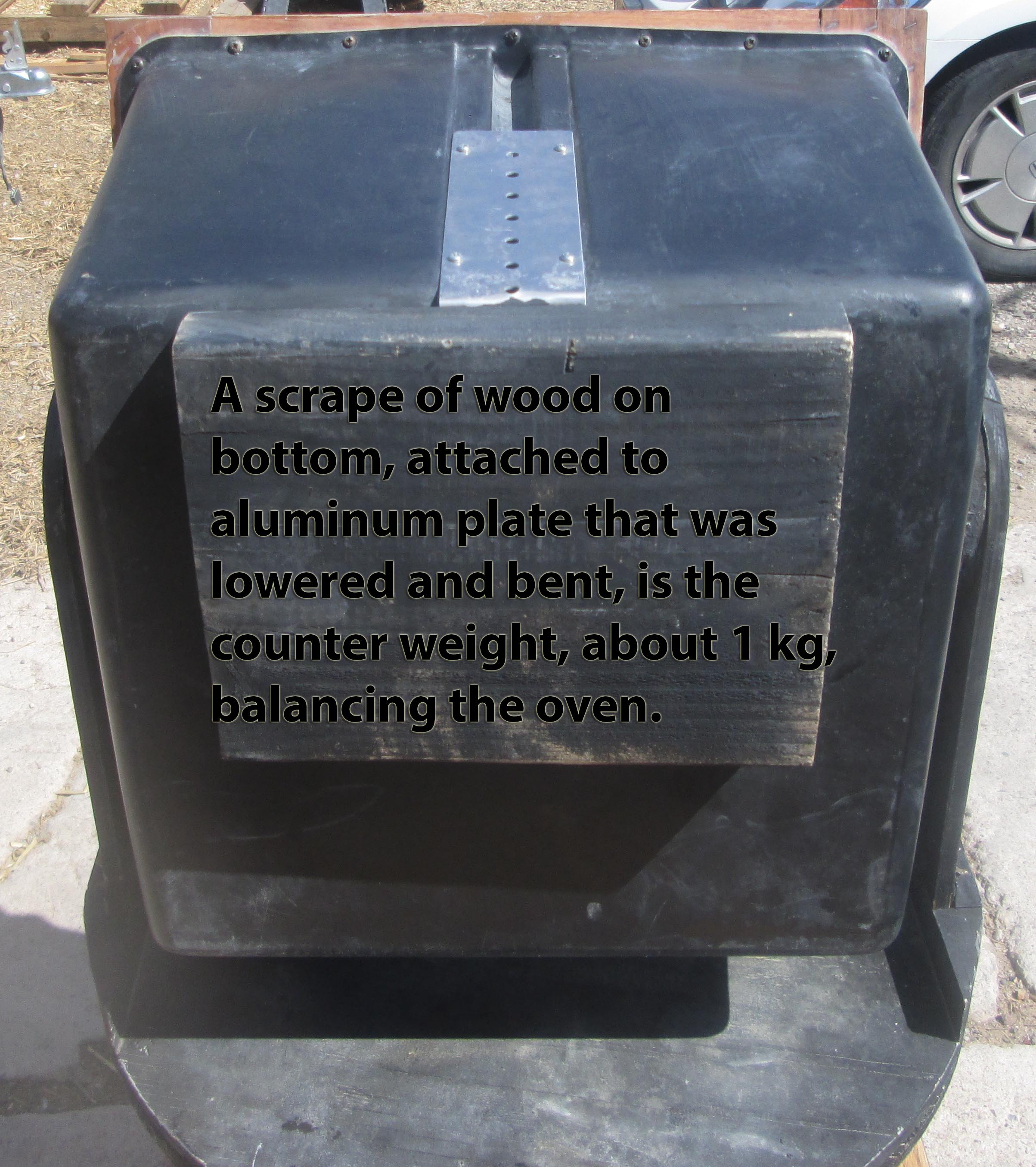 The somewhat tricky part was to put two 1 inch thick pieces of 6 inch diameter plywood (each two ½ inch circles glued together) attached to the sides of the SUN OVEN®. From the middle extends a recessed bolt that the arms attach to. Attaching this circle, which I made thick to allow later adding more insulation, was tricky as the outside of the SUN OVEN® is plastic, probably polyethylene, which nothing sticks very well to.