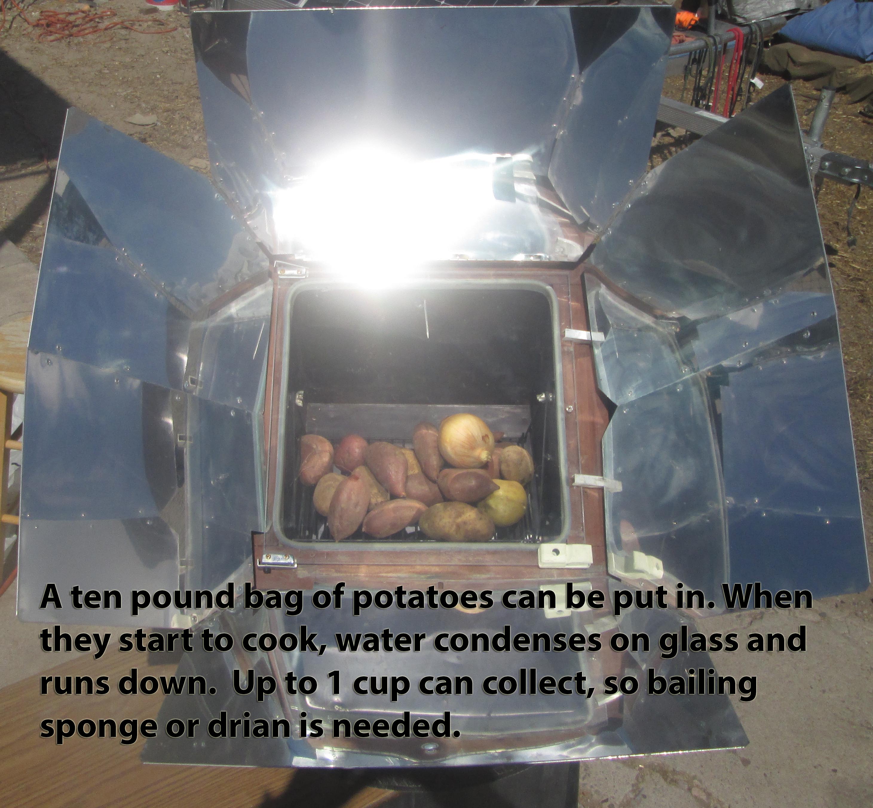 The All American SUN OVEN® is about $300 without accessories. It is a solar slow cooker. The only thing oven-like is that medium sized ovenware dishes and trays fit inside (unlike the original SUN OVEN®). Unlike a pot in a glass bowl, you can dump a 10 lb bag of potatoes in a SUN OVEN® and even fit a small turkey in it.