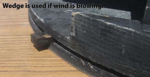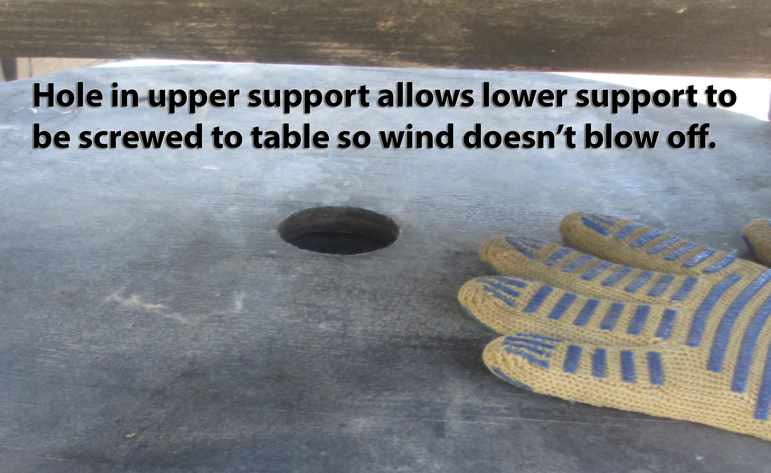 If set on the ground, then being blown over by a gust won't destroy the SUN OVEN® and the All American one comes with two metal stakes you can drive into the ground and pull up and drive in again as needed (but hey, you're an enthusiast, right?). Sitting the SUN OVEN® on a table would seem obvious, and is, but getting blown off can cause serious damage. When fully tilted a slight wind can blow it over. Preventing this requires attaching (as in tying down) the SUN OVEN® to the table or whatever you have to set it on. This works, but adjusting the SUN OVEN® also involves tying and untying it multiple times with each use. For the non-enthusiast this gets old.