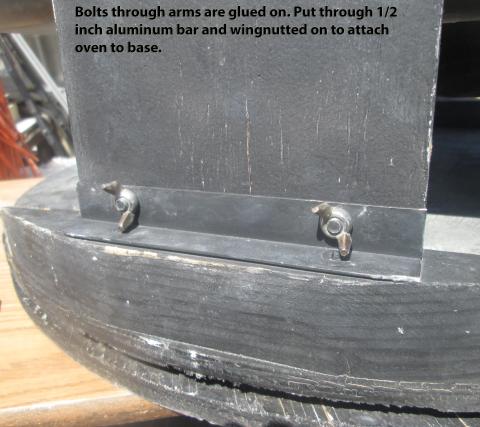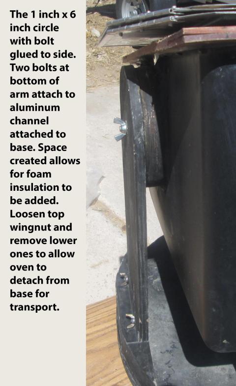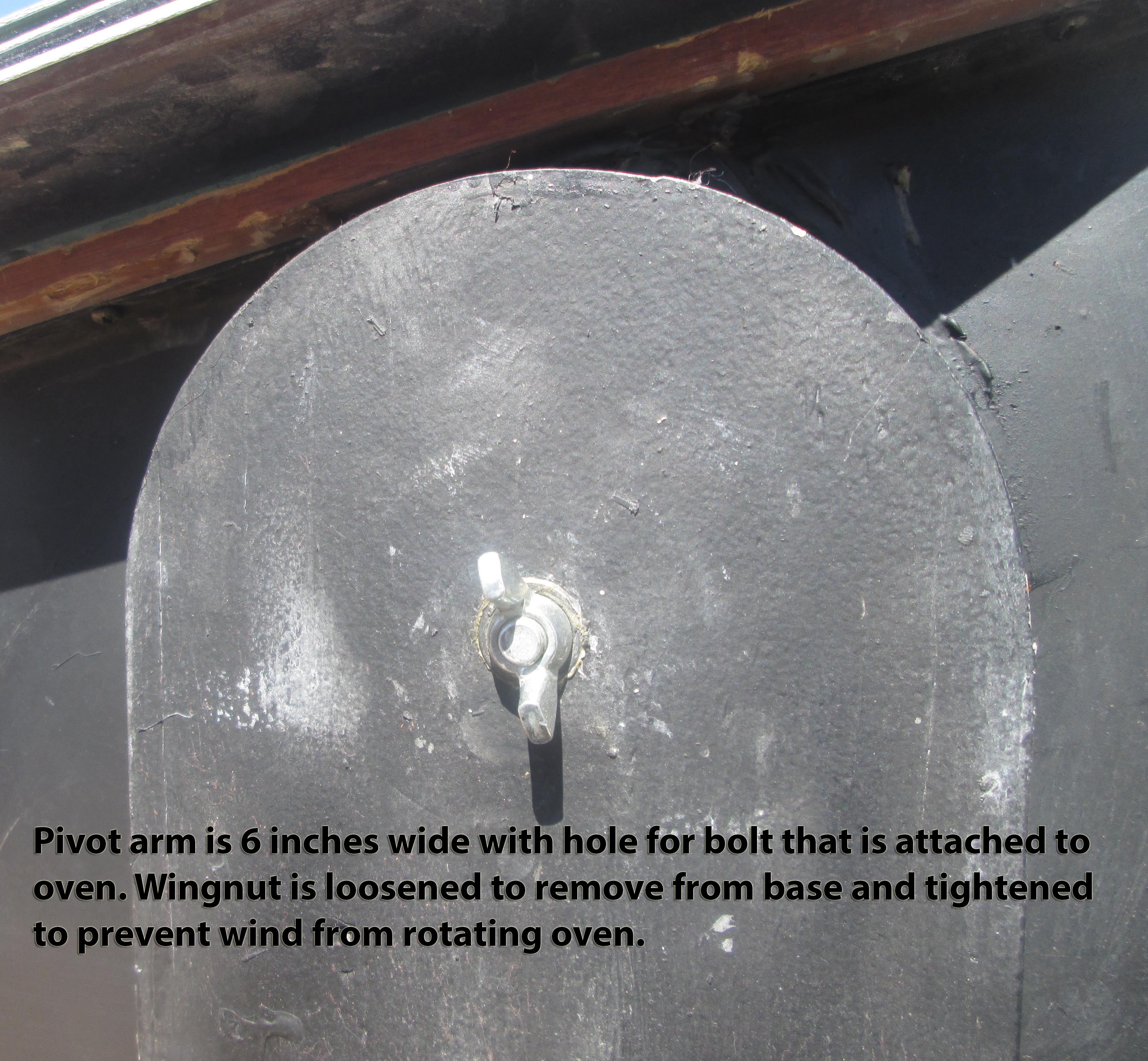 To reduce friction two pieces of stiff plastic or aluminum, such as from the bottom of disposable pie pans, go between oven and arms with grease between. The wingnuts can be tightened to increase friction just enough to not move in wind but allow tilting with a little push or pull to adjust. The arms detach at the bottom, and are not removed from the cooker, just loosened to remove.