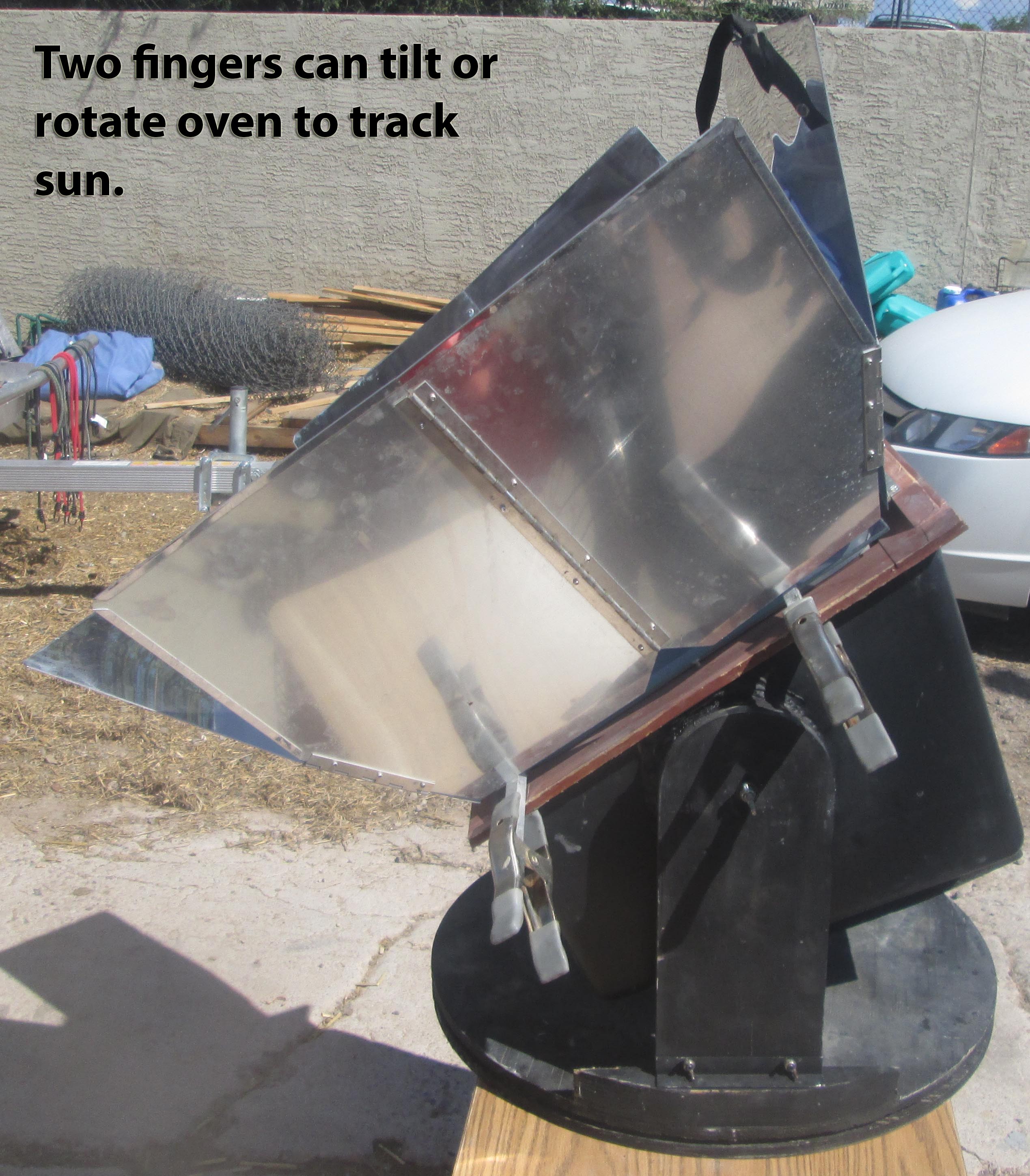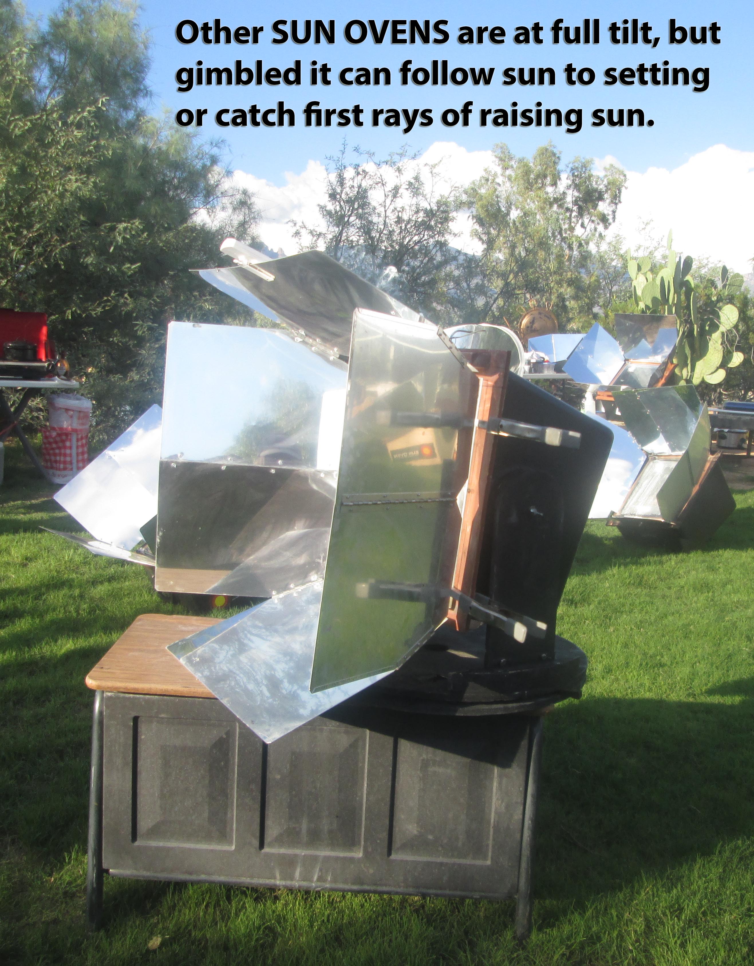 An obvious modification that significantly improves the functionality of the SUN OVEN® is to attach a lazy Susan to whatever and attach the SUN OVEN® to it in such a way that it can be readily detached for transportation. But wait, why stop there? Also gimble the cooker to allow the tilt angle to be easily changed. Adjusting the SUN OVEN® becomes a one handed (two finger) operation that takes a few seconds instead of a full upper body attack on a tied down SUN OVEN® taking minutes.