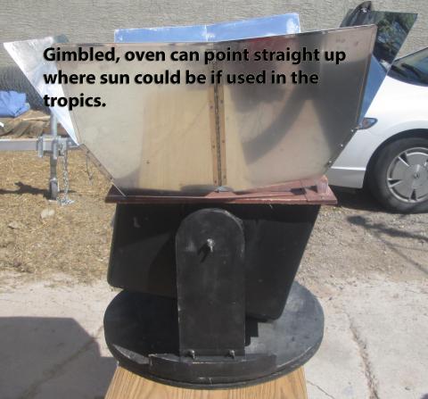 The gimble allows the reflectors to point straight up, as the sun may be in the tropics, and to follow the sun down or catch the first rays. Designing a solar slow cooker to not work in the tropics shows a temperate bias.